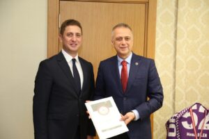 Seçilen yönetime ve meclise Başkan Karlıbel aracılığıyla hayırlı olsun dileklerini sunan Seçim Kurulu Başkanı Mesut Bilen, mazbatayı Başkan Karlıbel’e takdim etti.